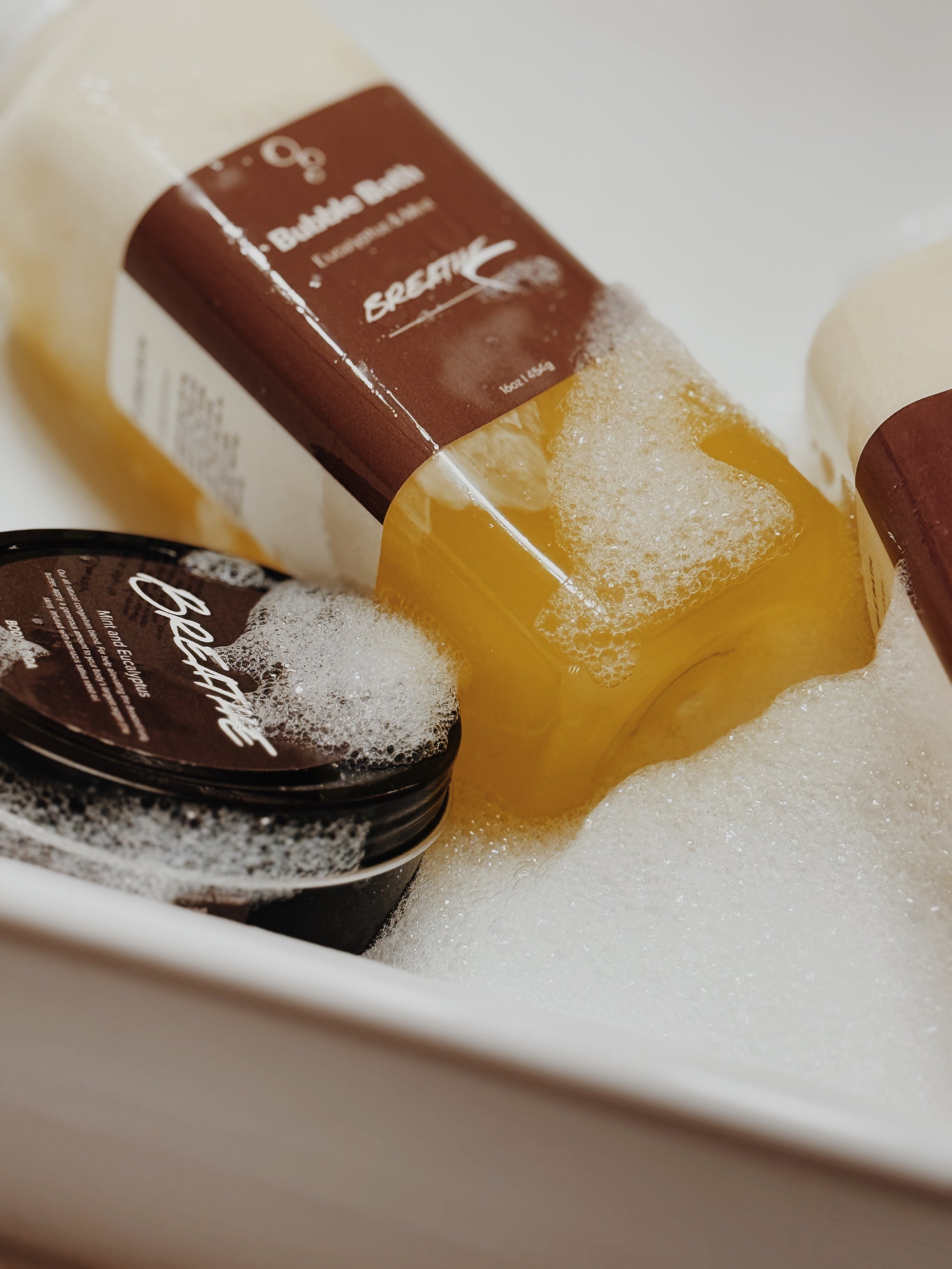 A 16 oz foaming bubble bath scented in Breathe — a crisp blend of eucalyptus and wintergreen (mint) essential oils that brings a fresh, cooling aroma to your bath.
