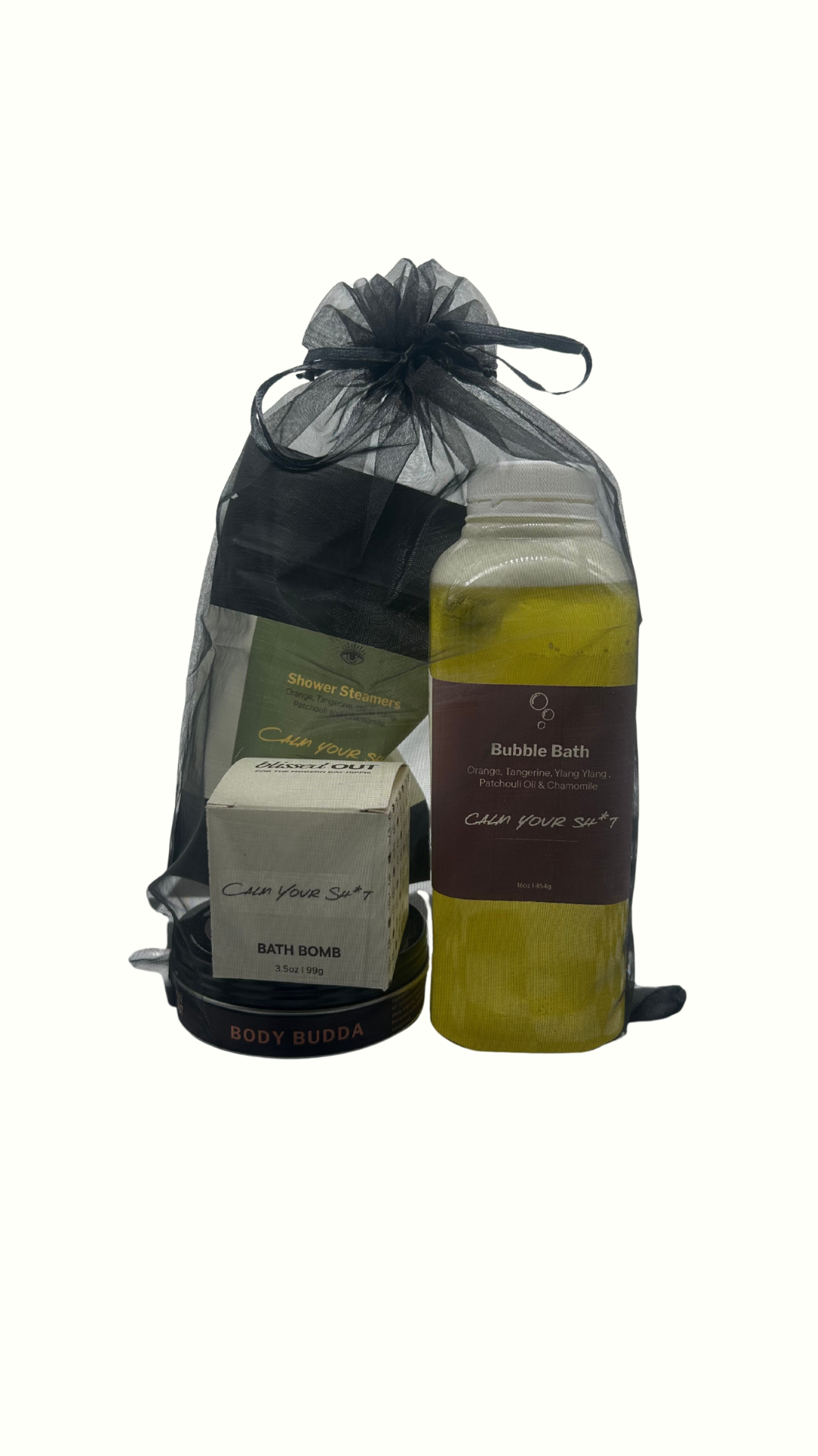 Introducing the 'Calm your sh*t' (Orange, Tangerine, Ylang Ylang, Patchouli and Chamomile essential oils) Bag Set. Includes; x1 body budda, x1 bubble bath, x1 bath bomb and x1 shower steamers.